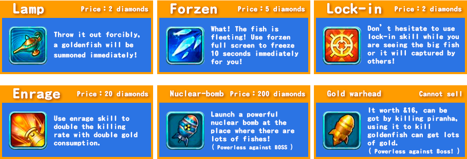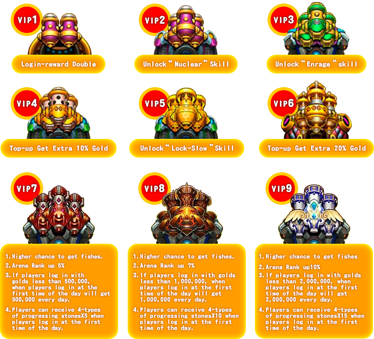 1. Different VIP Levels have different looks and skills. 2. Higher VIP Level will have higher % to hunt fishes. 3. Higher Cannon Level will have more chance to get higher level Bounty Fishes. * Players need to use diamonds to unlock the Cannon if Cannon Lv. is lower than Lv.1000 a. Click “Unlock” on the side. b. Click “+” on the side of Cannon, then click screen, then click “unlock.” * Players whose level over 1000 need stones to progress. In order to make progress, players need cost some diamonds. |